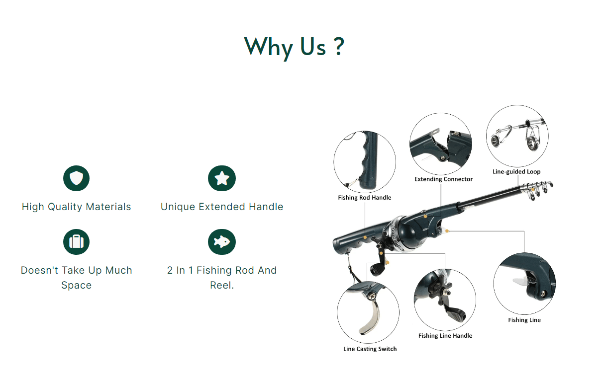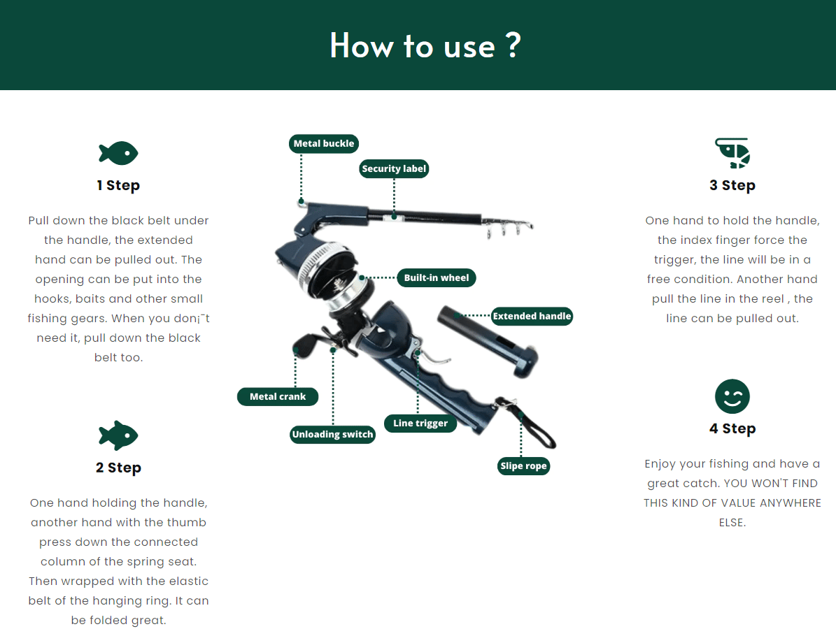 Starts with our amazing folding fishing rod! This compact wonder tool is perfect for professionals and novice anglers alike. Light in weight, it is perfect for long hikes and ready to be your trusted companion in the world of fishing